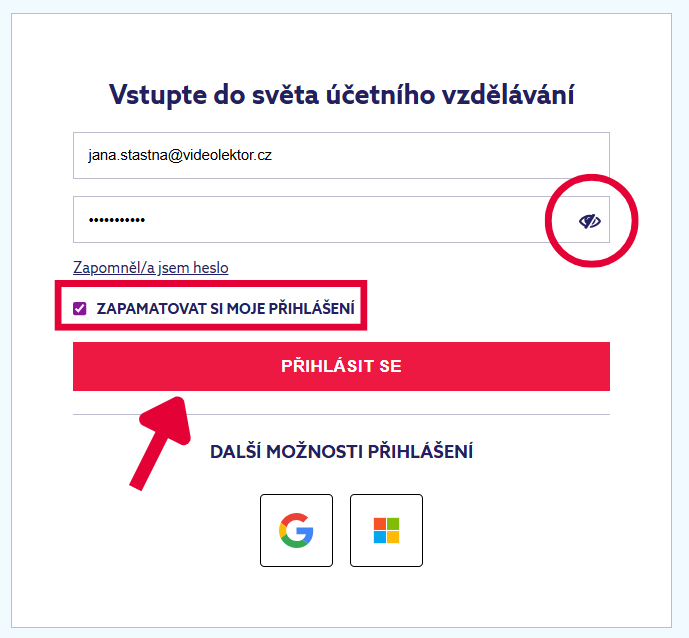 Lehko se tak přihlásíte na školení nebo zhlédnete video, aniž byste se čímkoli zdržovali. Pokud si chcete pro kontrolu zobrazit heslo, které jste zadali, stačí kliknout na ikonu proškrtnutého oka vpravo.