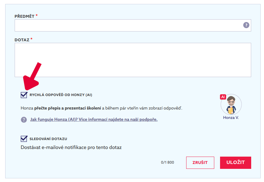 Zobrazí se vám formulář pro vepsání dotazu. Pokud si ponecháte zaškrtnutou možnost "RYCHLÁ ODPOVĚĎ OD HONZY (AI)", Honza přečte přepis a prezentaci školení a během pár vteřin vám zobrazí odpověď.
