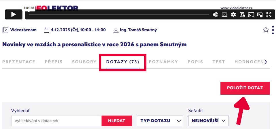 Otevřete si školení a pod videem v záložce "DOTAZY" klikněte na tlačítko "POLOŽIT DOTAZ".